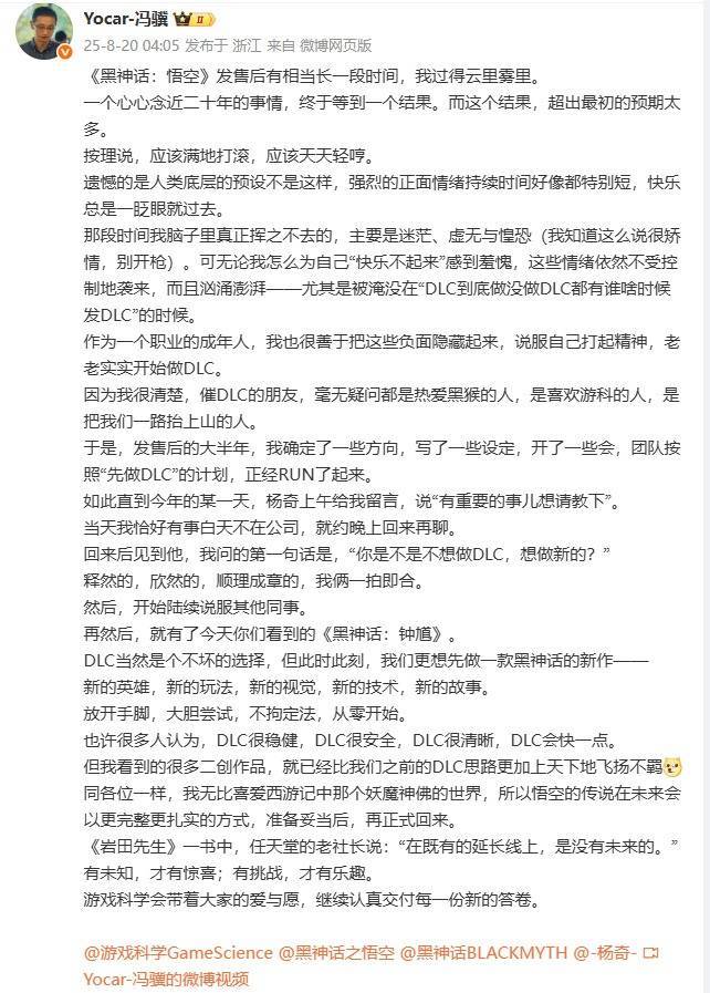 这位从荆州中学走出的金牌制作人,在《黑神话:悟空》创造国产3A神话一年后,再度以突破性思维开启全新征程。在团队官方答疑中,冯骥坦言:“天命人的故事暂告段落,我们渴望更具差异化的游戏体验。”《黑神话:钟馗》正是团队跳出舒适圈的主动选择——放弃稳妥的DLC开发路径,转而构建全新的中国神话宇宙。